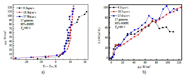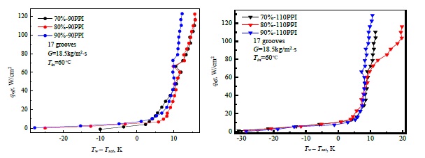 Structural parameters effect, pore density and porosity, are investigated in detail. Figure 6a shows measured boiling curves of 90 PPI samples with different porosity, namely 70, 80 and 90%.