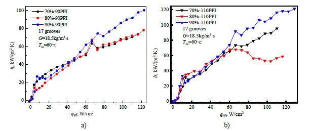Corresponding HTC curves are displayed in Figure 5b for copper foam samples with 90% and 90 PPI. From Figure 5b, two grooved samples are almost similar in performance with that of the grooveless sample in the single-phase region. After larger than 10 W/cm2, HTC curves of two grooved samples increase more rapidly than the grooveless sample. When the heat flux is larger than 60 W/cm2, the HTC curves of 17-grooved samples continue to exhibit an increase trend while that of 11-grooved begins to fall gently. Seventeen-groove copper foam reaches the largest HTC of 100 kW/(m2·K) in the heat flux of 123 W/cm2, which is three times as large as that of grooveless sample.