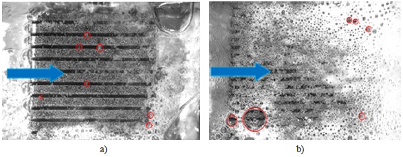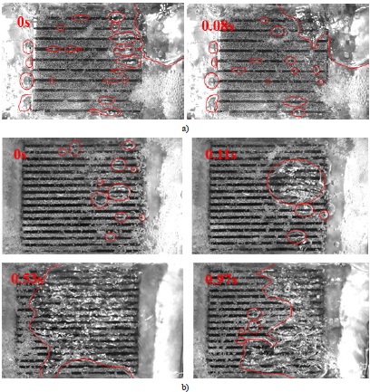As the heat flux is increased to 54 W/cm2, both kinds of samples also show great difference. Boiling behaviors of 11-grooved sample are shown in Figure 10a over a period of time. At t = 0 s, the supercooled nuclear boiling occurs in channels. Mainstream liquid contains a large number of small bubbles.