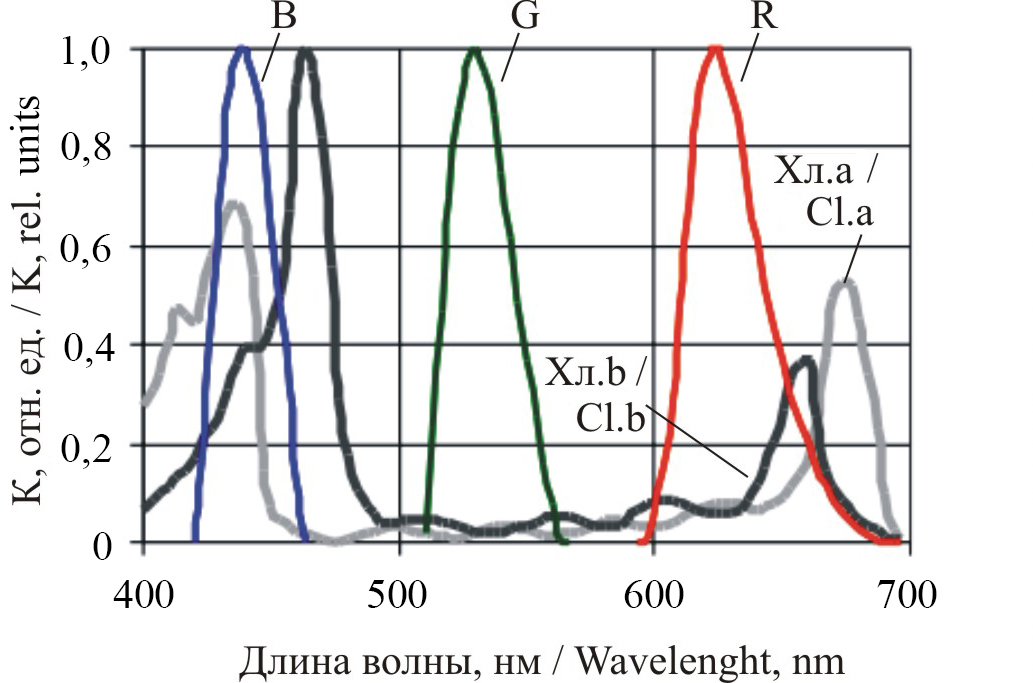Примечание: B – кривая пропускания синего светофильтра; G – кривая пропускания зеленого светофильтра; R – кривая пропускания красного светофильтра; Хл.a – спектр поглощения хлорофилла а; Хл.b – спектр поглощения хлорофилла b.