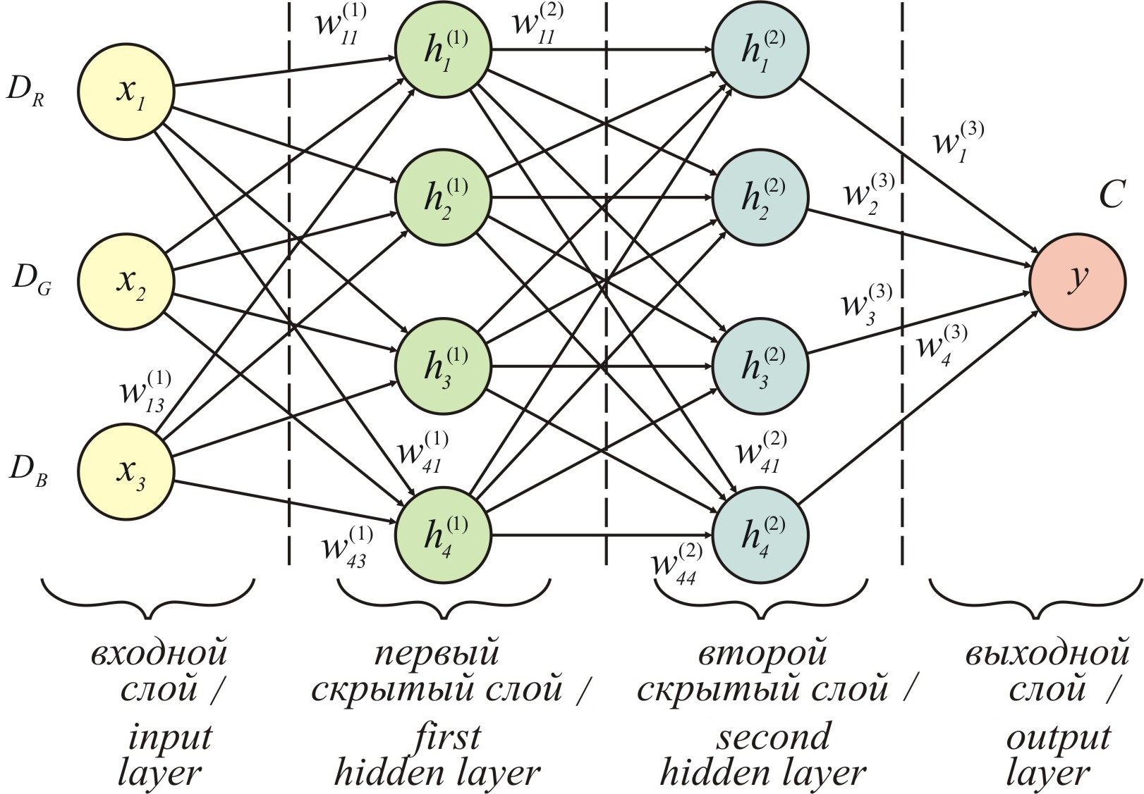 Примечание: DR , DG , DB – оптическая плотность листа соответственно в красном, зеленом и синем диапазоне; x1, x2, x3 – входные признаки; – выходные сигналы нейронов первого скрытого слоя; – выходные сигналы нейронов второго скрытого слоя; y – целевая переменная; C – прогноз содержания хлорофилла; – весовые коэффициенты нейронов первого слоя; – весовые коэффициенты нейронов второго слоя; весовые коэффициенты нейронов выходного слоя.