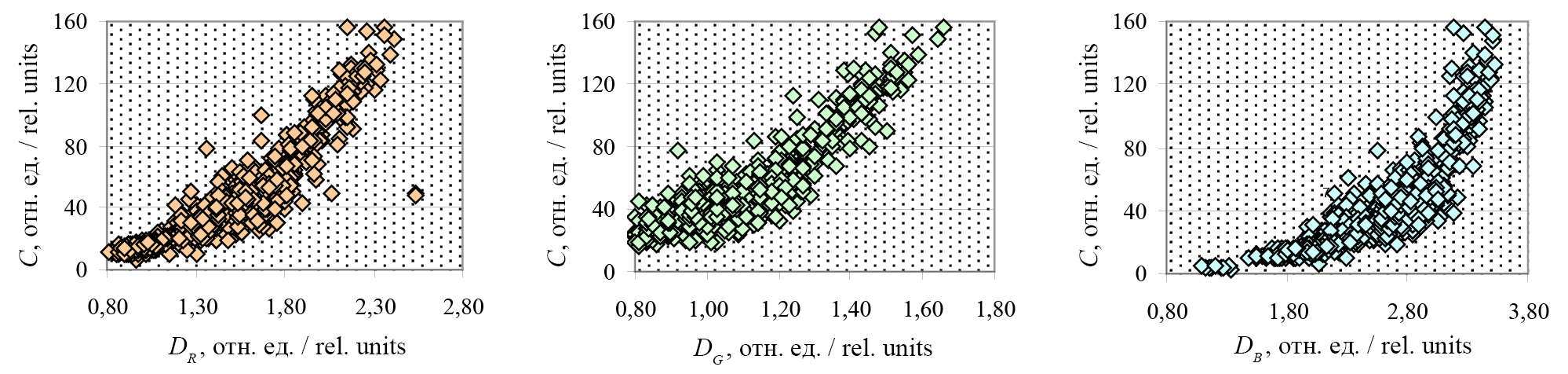 Рис. 6. Связь СС (C) и оптической плотности листа в красном , синем и зеленом диапазонах