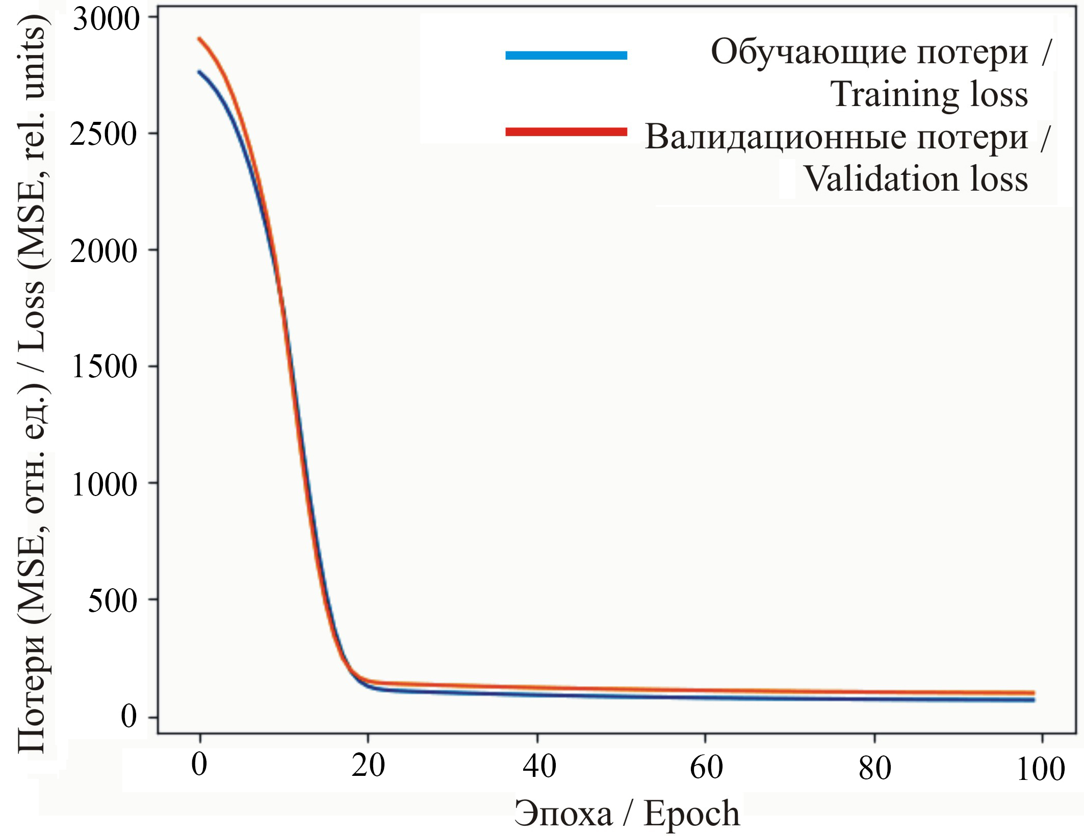 На рисунке 7 представлены графики обучающих и валидационных потерь при работе ИНС, построенные в следующих координатах: ось X – номер эпохи; ось Y – значение функции потерь MSE. Графики показывают динамику изменения ошибки модели в процессе обучения.