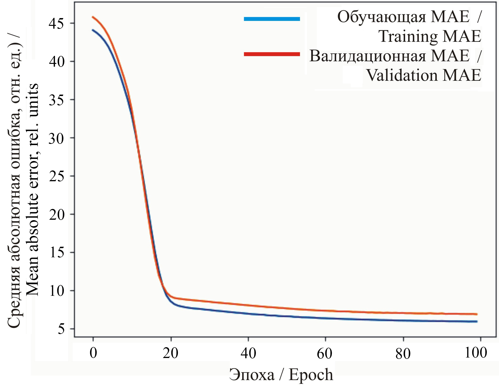 На рисунке 8 представлены графики обучающей и валидационной ошибки. Средня абсолютная ошибка MAE = 6,83 отн. ед.