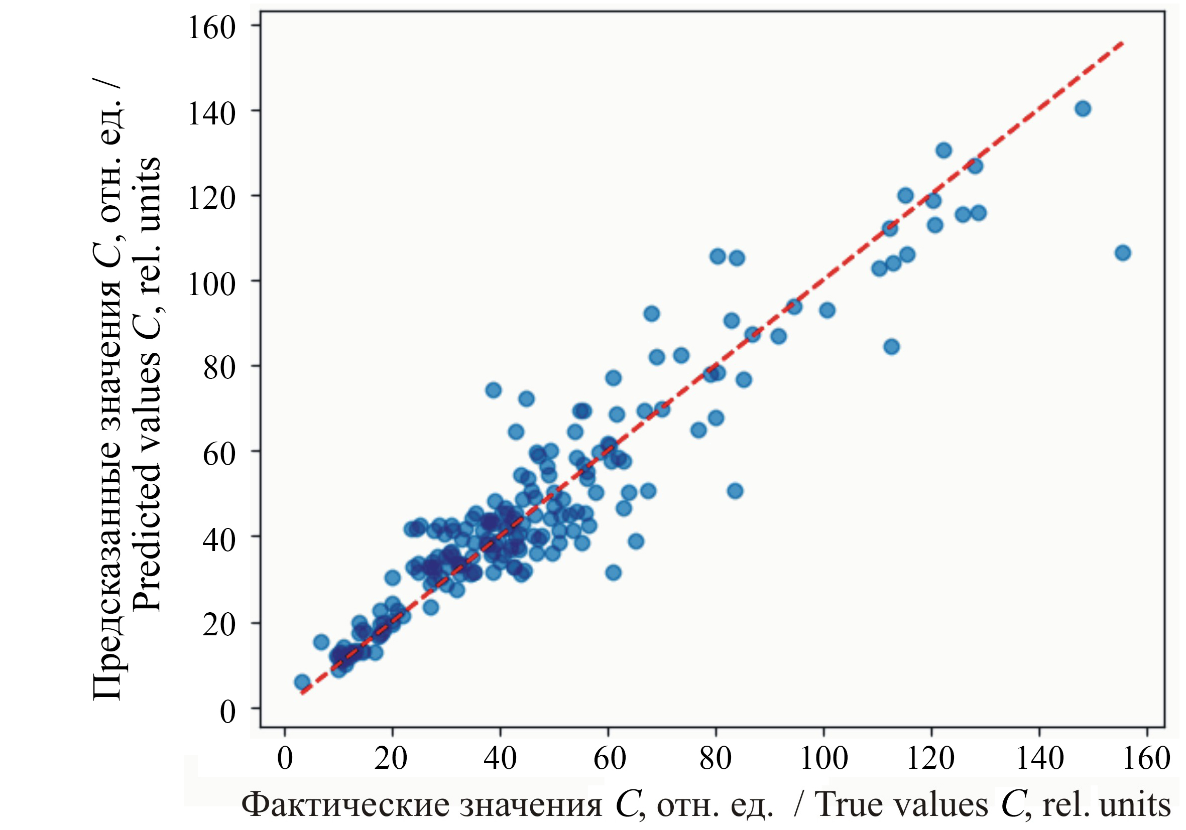 На рисунке 9 фактические значения (True Values) сопоставляются с предсказанными (Predicted Values). Рассмотрение графика сопоставления истинных значений СС и предсказанных моделью дает важные сведения о точности и надежности разработанной модели. Большая часть точек расположена вблизи диагональной прямой, что свидетельствует о хорошем совпадении предсказанных значений с реальными. Чем ближе точка к диагонали, тем точнее работа модели. Скопление точек в нижней части графика (первая треть диапазона изменения СС) указывает на лучшее качество предсказаний для образцов с низким уровнем хлорофилла. Вместе с анализом первичных данных (рис. 6) это свидетельствует о том, что листья с низким СС были представлены в большем количестве в исходном наборе данных или имели большую однородность, облегчающую обучение модели. Отдельные точки располагаются далеко от диагонали, что указывает на наличие значимых ошибок в предсказаниях. Причины могут включать плохую репрезентативность таких случаев в обучающем наборе, трудности распознавания сложных ситуаций или аномалии в данных. Возможно, в модель необходимо включить дополнительные входные признаки, такие как вид растения и физически измеряемую толщину листа. В целом модель работает удовлетворительно, особенно для малых значений СС, но требует доработки для повышения точности предсказаний в полном диапазоне возможных значений.