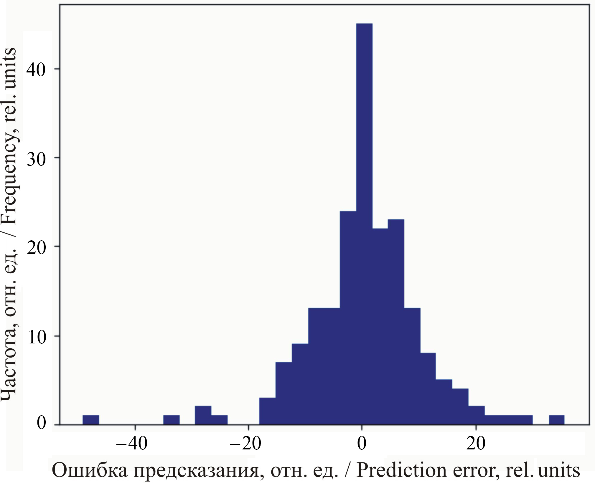 Форма кривой указывает на хорошую статистику обученной модели. Симметричность и центрирование пика около нуля предполагают, что большинство ошибок невелики и сконцентрированы около среднего значения. Это важный аспект, подтверждающий устойчивость и правильность работы модели. Пик кривой располагается около нулевых ошибок, его величина указывает на значительную долю успешных предсказаний с малой ошибкой. Подавляющее большинство ошибок находится в пределах диапазона ±20 отн. ед. Присутствие редких выбросов на краях графика подразумевает существование небольшого процента крупных ошибок. Такие исключения важны для понимания источников систематических сбоев модели и требуют отдельного анализа. Наблюдаемая картина распределения ошибок свидетельствует о приемлемом уровне качества модели, что обеспечит надежность и применимость модели в практических целях.