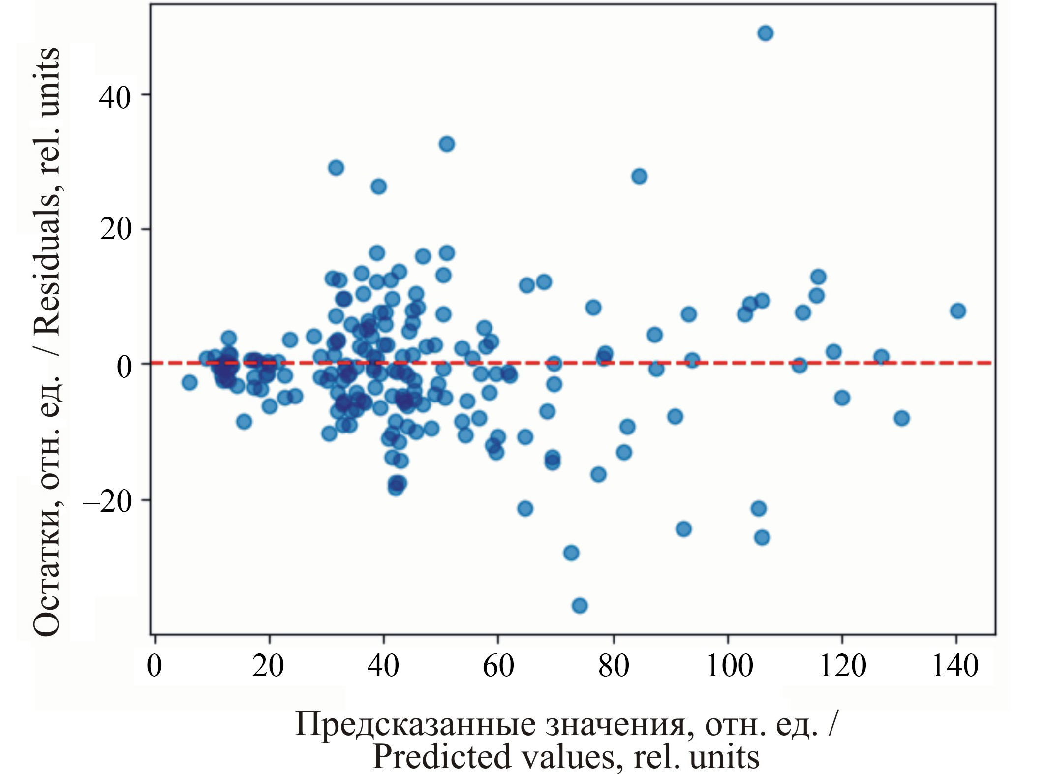 На рисунке 11 представлен график остатков, в котором сравнивается разница между предсказанными и действительными значениями СС, что помогает диагностировать качество модели, выявляет ее сильные и слабые стороны. Их случайное и несмещенное распределение относительно нуля соответствует одному из ключевых статистических предположений регрессионного анализа.