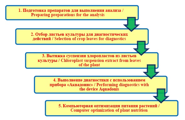 Перспективен метод функциональной листовой диагностики, ориентированный на активизацию процесса продуцирования урожая – фотосинтеза [19; 20]. Учитывая, что удобрения действуют не только на растения, но и на микроорганизмы почвы, оказывающие значимое влияние на развитие растений, результат биохимических процессов в растениях и почве можно оценить лишь по реакции живых растений конкретных культур на присутствие удобрений [21; 22].