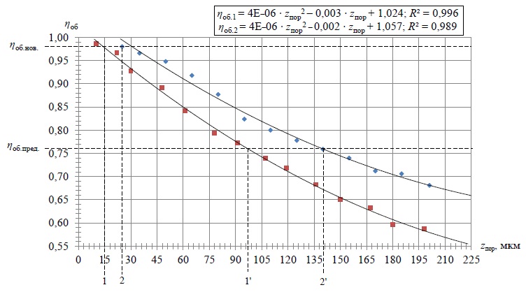 4. Fig. 3. Change in the volumetric efficiency caused by a clearance in the connection “piston – sleeve” zпор: ηоб.нов. – maximum value of volumetric efficiency with a minimum technological clearance in the connection of the new hydraulic drive Hydrosila; 0.76 – limit value of volumetric efficiency; 1 – clearance corresponding to ηоб.нов. for hydraulic drive Sauer-Danfoss (zпор.нов.1 = 15 μm); 2 – clearance corresponding to ηоб.нов. for hydraulic drive Hydrosila (zпор.нов.2 = 25 μm); 1' – clearance corresponding to ηоб.пред. for hydraulic drive Sauer-Danfoss (zпор.пред.1' = 97 μm); 2' – clearance corresponding to ηоб.пред. for hydraulic drive Hydrosila (zпор.пред.2' = 140 μm)