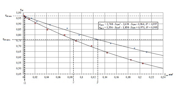6. Fig. 5. Change in volumetric efficiency caused by the total area of wear in the connection “block with solder – distributor” and “distributor 1 – distributor 2” Sсум: ηоб.нов. – maximum value of volumetric efficiency with a minimum wear area in the connection of the new hydraulic drive Hydrosila; 0.76 – limit value of volumetric efficiency; 1 – total wear area corresponding ηоб.нов. for hydraulic drive Sauer-Danfoss (Sсум = 0.001 mm2); 2 – total wear area corresponding ηоб.нов. for hydraulic drive Hydrosila (Sсум = 0.002 mm2); 1' – total wear area corresponding ηоб.пред. for hydraulic drive Sauer-Danfoss (Sсум.пред.1' = 0.086 mm2); 2' – total wear area corresponding ηоб.пред. for hydraulic drive Hydrosila (Sсум.пред. 2' = 0.128 mm2