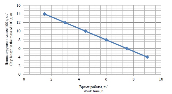 При проведении производственных испытаний на предмет исследования процессов изнашивания и разрушения граней ножа использовался регламент работ сахарных заводов, когда заточка и замена разрушенных ножей осуществлялись после сменной наработки центробежной свеклорезки. Данные испытаний сведены в график, представленный на рисунке 7.