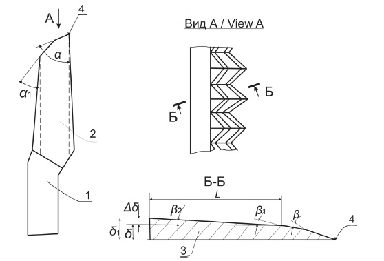 Упрочнение режущей грани ножа обеспечивается за счет создания переменного угла заострения от режущей кромки к основанию грани. Конструктивно грань ножа 3 подвергается утолщению путем приращения заострения от основного угла β = 8–10° с последующим утолщением стенки на углы β1, создающие дополнительное заострение на 4-5° с вершиной 4 на расстоянии 1,5–2,0 толщины сечения грани от начального состояния. Режущая кромка подвергается заострению основного α и дополнительного α1 углов. Дополнительный угол заострения β2 относительно β и β1 повышает толщину грани в опасном сечении на δ = 1,2–1,5 мм, подвергаемом активному воздействию напряжений на изгиб граней по длине грани l. Данное утолщение режущих граней позволит повысить их выносливость на изгиб. Дополнительное упрочнение режущих граней и повышение их износостойкости обеспечивается за счет использования горячей пластической деформации заготовки в штамповой оснастке. Формообразование граней ножа осуществляется по схеме, представленной на рисунке 5.