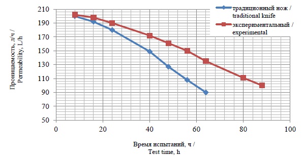 Предельного состояния экспериментальные ножи достигают после наработки 80 часов, что говорит о повышении показателя их долговечности на 27–30 %, причем за этот период разрушению подвергся 1 нож.