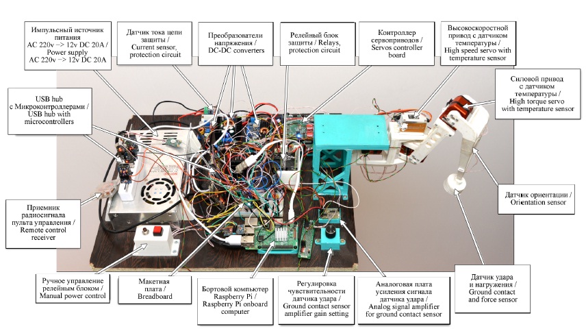 Опора помимо датчиков тока и положения выходного вала каждого привода имеет датчик ориентации в пространстве (акселерометр с гироскопом) и датчик удара и нагружения опоры с регулируемой чувствительностью. Каждый привод имеет датчик температуры для предотвращения его перегрева. На стенде присутствует система синхронизации контроллеров, контроллер приема сигналов с радиопульта управления оператора. Стенд полностью моделирует электронную систему шагающей машины, силовые цепи и бортовую вычислительную систему.