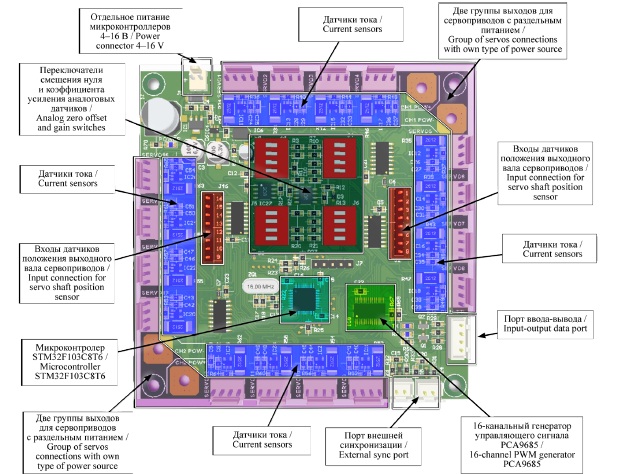 На стенде установлен мини-компьютер Raspberry Pi, импульсный источник питания, преобразователи напряжения, цепи силовой защиты, USB hub для подключения микроконтроллеров, отвечающих за первичную обработку данных с датчиков с последующей передачей в цифровом виде на бортовой компьютер. Датчик тока и напряжения в цепях силовой защиты от замыкания и перенапряжения и высокотоковое реле обеспечивают защиту от перегрузки и короткого замыкания электрической цепи. Одной из важных составляющих стенда является контроллер сервомеханизмов. Контроллер включает в себя датчики тока и аналоговые датчики положения выходного вала привода. На плате установлены переключатели для преобразования входных аналоговых сигналов, что дает возможность применять широкий спектр моделей сервомеханизмов с различными значениями сигналов обратной связи по напряжению (рис. 5).