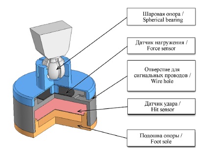 Каждая опора шагающей машины оснащена датчиком удара и нагружения (рис. 6). Комплекс датчиков позволяет определять касание опорой поверхности и развиваемое при этом усилие.