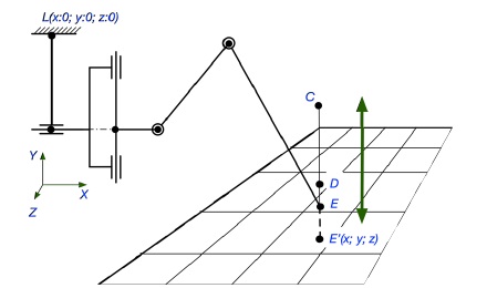 Смоделируем опускание опоры на поверхность. Для этого на стенде изобразим движение опоры по вертикали (рис. 7). Зададим начальное положение опоры в точке C и быстрое движение опоры вниз до точки D. Затем будем опускать опору ниже по траектории DE с малой скоростью. На участке DE необходим триггер, срабатывающий на удар с поверхностью, на нарастание сигнала датчика усилия или резкое увеличение показания датчика ускорения. Для отрыва опоры от поверхности и снижения колебаний корпуса машины необходимо поднимать опору медленно по траектории ED. На данном участке траектории движения необходим триггер снятия нагрузки с опоры. Как только нагрузка уменьшится, можно ускорить движение опоры к точке С.
