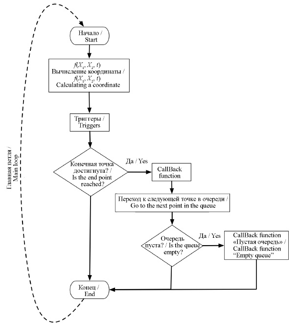 Алгоритм вычисления координат положения кончика опоры работает циклически и запускается через заданный интервал времени. Интервал времени зависит от скорости бортового компьютера и скорости обработки команды контроллеров привода. При каждой итерации вычисляется координата кончика опоры, решается задача обратной кинематики, результатом которой являются угловые значения приводов опоры. Проверяется набор триггеров в цикле и, если они сработали, вызываются функции корректировки движения.