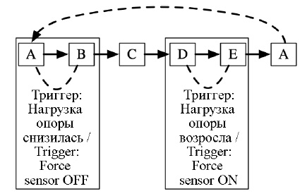 Во время движения может возникнуть необходимость проверять значения датчиков. Примером такой необходимости служит участок траектории DE (рис. 3). При движении опоры на данном участке необходимо проверять значение весового датчика. Если его показания увеличились, значит опора достигла поверхности земли и способна нести вес корпуса. При срабатывании заданного условия можно вызвать какую-нибудь функцию, например зажечь лампочку, показывающую срабатывание датчика веса, добавить задержку выполнения команд или перейти к следующей точке траектории. Данное архитектурное решение в построении алгоритма позволяет легко создавать стандартные цепочки координат движения машины.