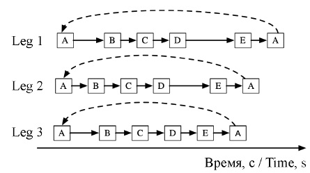 Для одной опоры на стенде алгоритм показал хорошие результаты. Перенос данного алгоритма на многоногую систему потребовал добавления новых функций синхронизации. Поскольку опоры движутся с разными скоростями и поверхность под машиной может быть неровной, то программный код некоторых цепочек из точек будет выполняться быстрее, что при увеличении числа циклов приведет к хаотичному движению опор и машина перестанет двигаться. Временная диаграмма цепочки вершин без синхронизации представлена на рисунке 10.