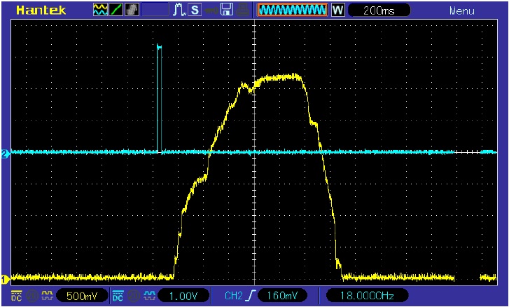 Рис. 11. Осциллограмма сигналов с датчика удара и датчика нагружения опоры: голубой