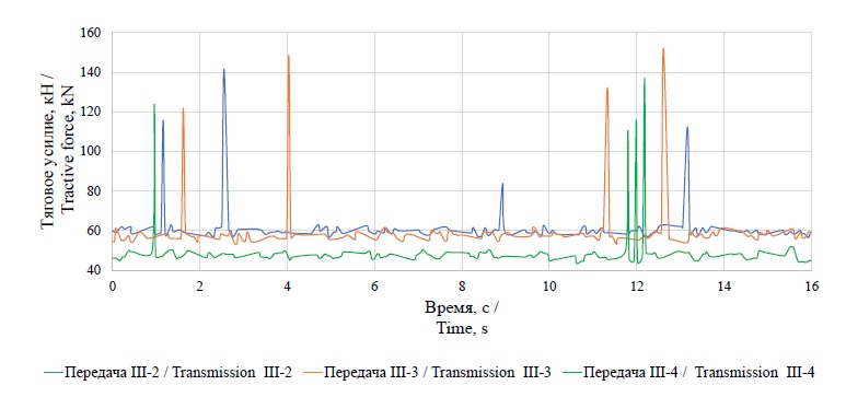 На передаче III-2 (рис. 5a) отмечено шесть кратковременных выбросов значений тягового усилия, при этом пиковое значение достигает 154 кН при установившемся значении тягового усилия ≈60 кН. После обработки цифровым фильтром выбросов больше нет. На передаче III-3 (рис. 5b) отмечено четыре кратковременных выброса значений тягового усилия, при этом пиковое значение достигает 152 кН при установившемся значении тягового усилия ≈57 кН. После обработки выбросы отсутствуют. На передаче III-4 (рис. 5c) отмечено четыре кратковременных выброса значений тягового усилия, при этом пиковое значение достигает 137 кН при установившемся значении тягового усилия ≈48 кН.