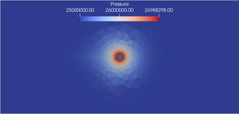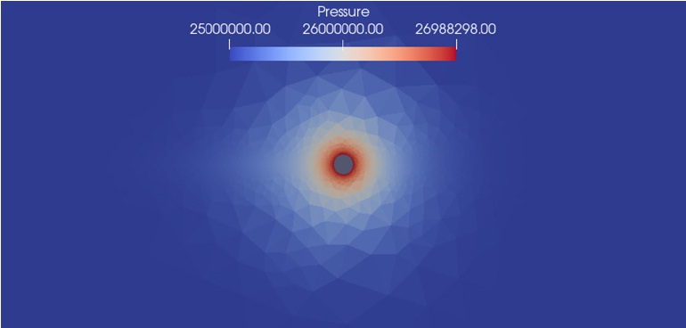 На практике наибольший интерес представляет состояние призабойной зоны пласта. В связи с этим, а также из-за большого масштаба задачи дальнейшие рисунки представляют не всю расчетную область, а ее часть, приближенную к скважине. На рисунке 3 представлена расчетная сетка возле скважины, диаметр скважины 0,05 м.