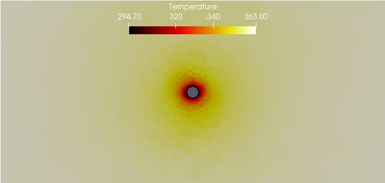В настоящей статье разработан и реализован вычислительный алгоритм для моделирования динамики изменения температуры и давления в нефтеносном пласте. Алгоритм построен на основе метода Галеркина с разрывными базисными функциями на разнесенных неструктурированных сетках с применением технологии параллельных вычислений MPI. С использованием разработанного программного кода была исследована задача закачивания в пласт охлаждающей жидкости через вертикальную нагнетательную скважину. Можно сделать вывод, что результаты моделирования показывают адекватные картины для температурного поля и поля давления в пласте, соответствующие заданным начально-краевым условиям. Для более точного моделирования рассматриваемого процесса в дальнейшем планируется решать данную задачу в трехмерной постановке на неструктурированных тетраэдральных сетках.
