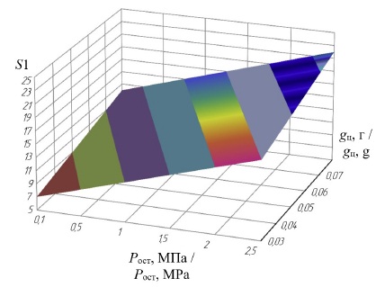 На графиках (рис. 6) видно, что повышение остаточного давления до 2,5 МПа приводит к увеличению площади S1 более чем в 2 раза, что повышает точность при измерении малых цикловых подач. Необходимый для ее корректировки поправочный коэффициент при этом линейно возрастает с 1,0 до 0,466.