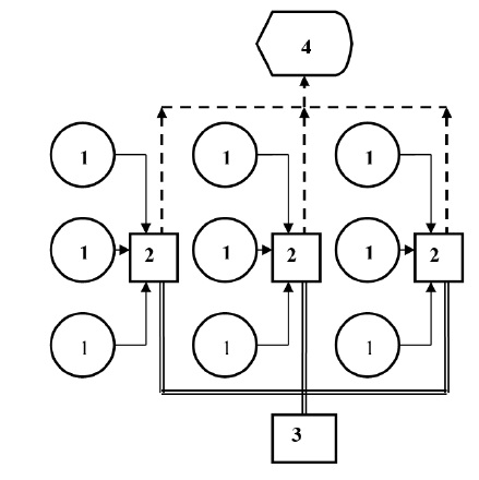 База знаний 1 содержит нормативно-справочную информацию для выполнения технологических процессов, архив данных за предшествующие периоды. В блоке анализа 2 выполняются операции сравнения текущих информативных значений параметров микроклимата. В блоке анализа 3 выполняются операции сравнения расчетных значений параметров микроклимата на соответствие установленным нормативам. Результат анализа транслируется на компьютер специалиста 4 для принятия управленческих решений и архивируется в базе знаний 1.