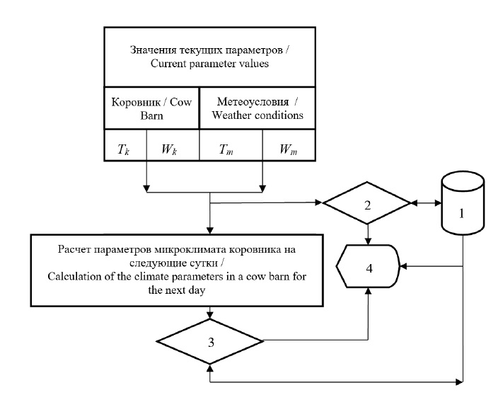 Discussion and Conclusion. An information predictive model was created to describe the formation of temperature and humidity conditions inside cow barns, depending on weather conditions. Under constant real-time database updating, the model allows monitoring the temperature and humidity in cow barns and forecasting these variables for the next few days. The relevant data are visualized in real-time on monitors and information panels for personnel and specialists supporting the timely managerial decisions to prevent critical situations associated with overheating or hypothermia of animals.