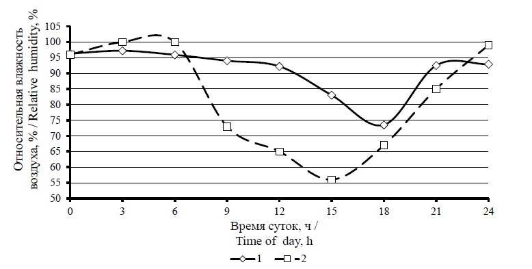 1 – средняя относительная влажность воздуха в коровнике в течение суток, %;