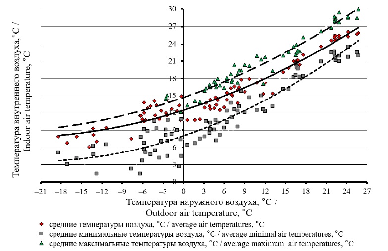 На рисунке 5 представлены экспериментальные зависимости температуры воздуха внутри коровника от температуры наружного воздуха для конкретной фермы по результатам мониторинга в течение года. График предоставляет возможность определить верхние и нижние границы температуры воздуха в коровнике при изменении температуры наружного воздуха.
