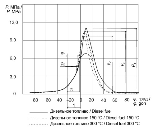 Discussion and Conclusion. On the basis of the conducted studies, the dependences of the parameters of the combustion process of a diesel engine with fuel heating to high temperatures are revealed. Indicator diagrams allow drawing a conclusion about the influence of the fuel heating temperature on the intensification of the combustion process. There is an acceleration of the beginning of heat release, a decrease in the rate of pressure build-up and in the rigidity of the engine.