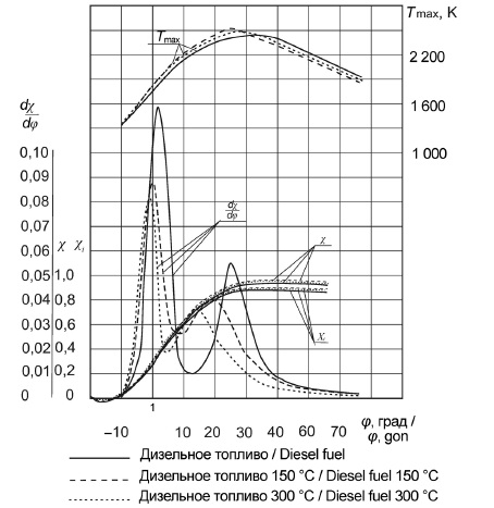 Скорость тепловыделения (dχ / dφ)max в кинетической фазе резко возрастает и в максимуме имеет значение при работе двигателя без подогрева (dχ / dφ)max = 0,1239, а с подогревом ДТ до 150 и 300 ºС равна 0,0893 и 0,0878 соответственно.