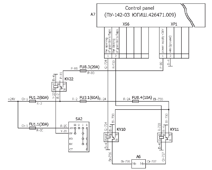 Рисунок 2 содержит следующие обозначения: FU1.1, FU1.2, FU3.1 – предохранители блока предохранителей 111.3732; FU 8.3, FU8.4 – предохранители блока предохранителей 46.3722; KV10, KV11, KV22 – реле 753.3777; SA2 – выключатель стартера и приборов ВК353; А6 – силовой привод DD24-21B5-24-385; А7 – пульт управления комбайна ПУ-142-03 ЮГИШ.426471.032; Or-1 – цепь провода 1 оранжевый; R-2 – цепь провода 2 красный; R-2А – цепь провода 2А красный; R-2С – цепь провода 2С красный; Y-20 – цепь провода 20 желтый; B-4 – цепь провода 4 черный; Р-80 – цепь провода 80 розовый; Р-81 – цепь провода 81 розовый; G-734 – цепь провода 734 зеленый; R-733 – цепь провода 733 красный; Bl-730 – цепь провода 730 голубой; Br-736 – цепь провода 736 коричневый; Or-737 – цепь провода 737 оранжевый.