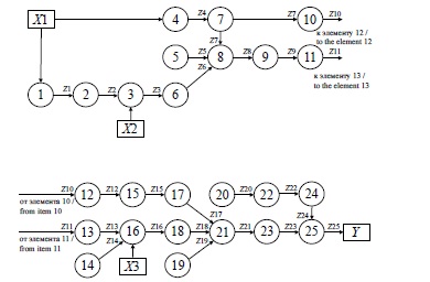 Рисунок 3 содержит следующие обозначения: 1 – FU1.1; 2 – R-2С; 3 – SA2; 4 – FU1.2; 5 – B-4 (на выводе 85 обмотки реле KV22); 6 – Y-20; 7 – R-2; 8 – KV22; 9 – Р-81; 10 – FU3.1; 11 – FU 8.3; 12 – R-2А; 13 – Р-80; 14 – B-4 (в разъеме ХР1 ПУ-142-03); 15 – FU8.4; 16 – А7; 17 – Bl-730; 18 – G-734; 19 – B-4 (на выводе 85 обмотки реле KV10); 20 – B-4 (на выводе 88 нормально замкнутого контакта реле KV11); 21 – KV10; 22 – KV11; 23 – Br-736; 24 – Or-737; 25 – А6; Х1 – внешнее воздействие (напряжение +24 В на входе блоков предохранителей FU1 и FU2); Х2 – внешнее воздействие (нажатие клавиши «открытие створок крыши бункера» на пульте ПУ-142-03); Х3 – внешнее воздействие (установка ключа стартера SA2 в положение I); Z1–Z25 – обозначения выходов элементов логической модели; Y – выходной параметр (перемещение штока силового привода).