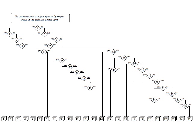 В ромбиках на рисунке 4 представлены следующие вопросы: 1 – есть напряжение +24 В на проводе Bг-736 у силового привода DD24-21B5-24-385 (блок А6)? 2 – есть соединение на «массу» на проводе Or-737 у силового привода DD24-21B5-24-385 (блок А6)? 3 – есть соединение на «массу» на выводе 30 общего контакта реле KV11(провод Or-737)? 4 – есть соединение на «массу» на проводе В-4 у вывода 88 нормально замкнутого контакта реле KV11? 5 – есть напряжение +24 В на выводе 30 общего контакта реле KV10 (провод Br-736)? 6 – есть напряжение +24 В на проводе Bl-730 у вывода 87 нормально разомкнутого контакта реле KV10? 7 – есть напряжение +24 В на проводе G-734 у вывода 86 обмотки реле KV10? 8 – есть соединение на «массу» на проводе B-4 у вывода 85 обмотки реле KV10? 9 – есть напряжение +24 В на проводе Bl-730 у предохранителя FU8.4 (10А)? 10 – есть напряжение +24 В на проводе R-2A у предохранителя FU8.4 (10А)? 11 – есть напряжение +24 В на проводе R-2A у предохранителя FU3.1 (60А)? 12 – есть напряжение +24 В на проводе R-2 у предохранителя FU3.1 (60А)? 13 – есть напряжение +24 В на проводе R-2 у предохранителя FU1.2 (60А)? 14 – есть напряжение +24 В на проводе G-734 в разъеме XS6 пульта управления ПУ-142-03 (блок А7)? 15 – есть напряжение +24 В на проводе Р-80 в разъеме XР1 пульта управления ПУ-142-03 (блок А7)? 16 – есть соединение на «массу» на проводе B-4 в разъеме XР1 пульта управления ПУ-142-03 (блок А7)? 17 – есть напряжение +24 В на проводе Р-80 у предохранителя FU8.3 (20А)? 18 – есть напряжение +24 В на проводе Р-81 у предохранителя FU8.3 (20А)? 19 – есть напряжение +24 В на выводе 87 нормально разомкнутого контакта реле KV22 (провод Р-81)? 20 – есть напряжение +24 В на проводе R-2 у общего вывода 30 реле KV22? 21 – есть напряжение +24 В на проводе Y-20 у вывода 85 обмотки реле KV22? 22 – есть соединение на «массу» на проводе В-4 у вывода 85 обмотки реле KV22? 23 – есть напряжение +24 В на выводе ПР выключателя стартера и приборов ВК353 (SA2)? 24 – есть напряжение +24 В на проводе R-2С у вывода AM выключателя стартера и приборов ВК353 (SA2)? 25 – есть напряжение +24 В на проводе R-2С у предохранителя FU1.1(60А)? В кубиках на рисунке 4 представлены возможные причины неисправности: 1 – неисправен силовой привод DD24-21B5-24-385 (блок А6); 2 – неисправна цепь провода Or-737; 3 – неисправно реле KV11; 4 – неисправна цепь провода B-4 (соединение на «массу» вывода 88 нормально замкнутого контакта реле KV11); 5 – неисправна цепь провода Br-736; 6 – неисправно реле KV10; 7 – неисправна цепь провода B-4 (соединение на «массу» вывода 85 обмотки реле KV10); 8 – неисправна цепь провода Bl-730; 9 – неисправен предохранитель FU8.4 (10А); 10 – неисправна цепь провода R-2A; 11 – неисправен предохранитель FU3.1 (60А); 12 – неисправна цепь провода R-2; 13 – неисправен предохранитель FU1.2 (60А); 14 – неисправна цепь провода G-734; 15 – неисправен пульт управления А7 (ПУ-142-03); 16 – неисправна цепь провода B-4 (соединение на «массу» в разъеме XР1 пульта управления ПУ-142-03 (блок А7); 17 – неисправна цепь провода Р-80; 18 – неисправен предохранитель FU8.3(20А); 19 – неисправна цепь провода Р-81; 20 – неисправно реле KV22; 21 – неисправна цепь провода В-4 (соединение на «массу» вывода 85 обмотки реле KV22); 22 – неисправна цепь провода Y-20; 23 – неисправен выключатель стартера и приборов ВК353 (SA2); 24 – неисправна цепь провода R-2С; 25 – неисправен предохранитель FU1.1(60А).