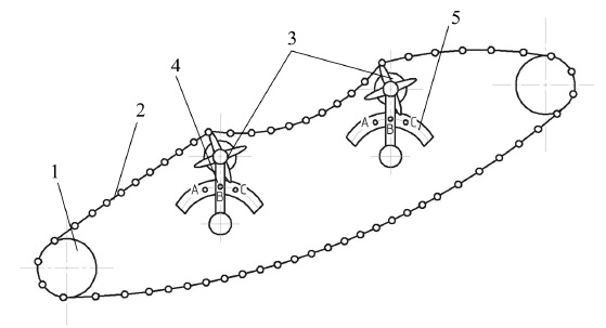Fig. 2. Separating chain digger: 1 – reversing rubber wheel; 2 – separation sieve; 3 – web agitators;