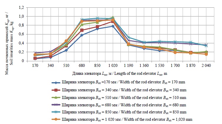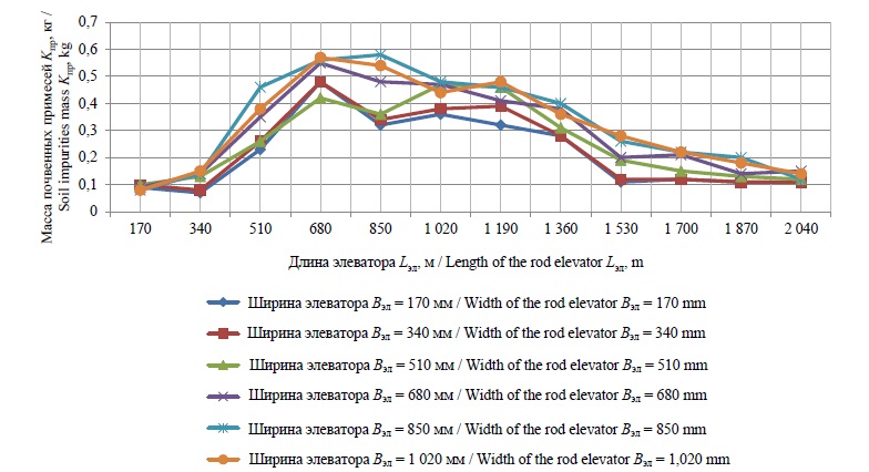 По результатам взвешивания просеянной почвы, изъятой из каждой ячейки устройства для сбора примесей и прошедшей через щелевые отверстия пруткового элеватора, определялась зависимость массы просеянных почвенных примесей Kпр по длине Lэл и ширине Вэл пруткового элеватора: