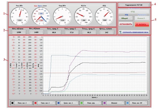 Fig. 5. Window of specialized software showing the process of conducting bench tests with the new GST-90 volumetric hydraulic drive: 1 – pressure in the pressure line 2; 2 – pressure in the line of the hydraulic loading device for the pressure line 1; 3 – temperature of the working fluid in the lines of the tested volumetric hydraulic drive; 4 – working pressure in pressure line 1; 5 – hydraulic pump