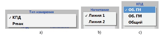 Основным блоком, позволяющим управлять ходом испытаний объемных гидроприводов, является блок управляющих кнопок, который содержит три раскрывающихся списка «Тип измерения», «Нагнетание» и «КПД». Данные списки в раскрытом виде представлены на рисунке 3.