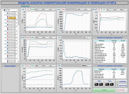 Для анализа измерительной информации и генерации отчета после проведения испытаний с объемными гидроприводами в разработанном специализированном программном обеспечении имеется модуль «Анализ». Данный модуль предназначен для обработки записанной во время испытания измерительной информации, а также для генерации отчета и экспорта изображений (зависимостей параметров диагностирования от времени).