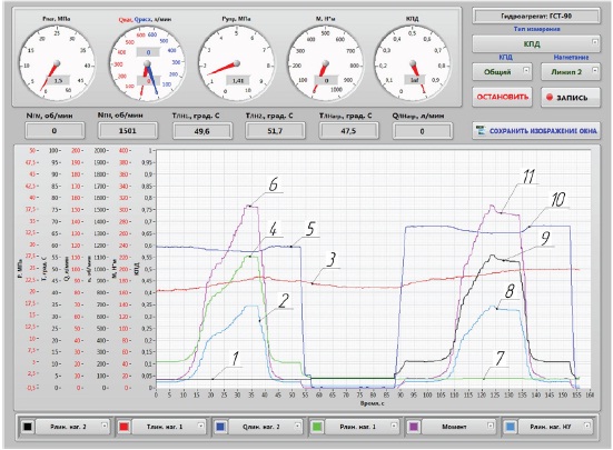 На рисунке 5 представлено окно специализированного ПО, которое отображает процесс стендовых испытаний с новым объемным гидроприводом ГСТ-90 в режиме реального времени.
