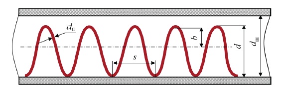 Обе нагревательные спирали, обозначенные как А и Б, изготовлены длиной по 10 м, соответствующей размеру шланга. Они различались диаметром d и шагом s спирали (рис. 1). При размещении в гибком шланге стальные спирали соприкасались с его поверхностью. Минимальное расстояние от витков спирали до оси шланга b = d – dп – 0,5dш.