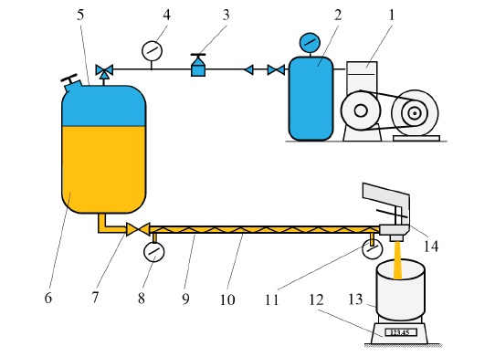 Fig. 2. Scheme of the stand for the study of the hydraulic resistance of the hose: 1 – compressor; 2 – receiver;