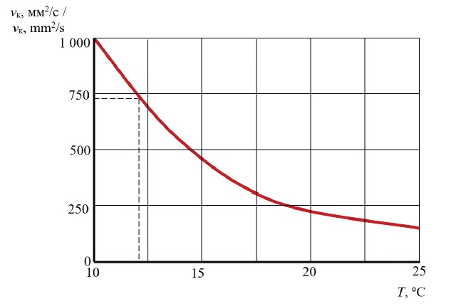 На первом этапе опыты выполняли при температуре 20 °С, исследовали потери давления в шлангах с холодными спиралями и в гладком шланге. Выявляли спираль, оказывающую меньшее гидравлическое сопротивление течению отработанного масла и загущенного консерванта. Кинематическую вязкость исследуемых жидкостей измеряли посредством вискозиметра Smart L. При 20 °С кинематическая вязкость отработанного масла νм = 122 мм2/с. Для загущенного консерванта определяли эффективную кинематическую вязкость, зависимость которой от температуры показана на рисунке 3. При 20 °С эффективная кинематическая вязкость загущенного консерванта νк = 236 мм2/с.