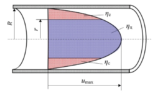 Рассмотрим схему движения двухслойного потока консерванта сквозь шланг, в которой не учитывается деформация шланга, гидравлическое сопротивление нагревательной спирали и потери тепла в атмосферу. Примем, что загущенный консервант относится к ньютоновской жидкости, его движение сквозь шланг является ламинарным и равномерным, при котором действует параболический закон распределения скоростей. На рисунке 4 приведен профиль скоростей потока и обозначены следующие показатели: umax – осевая скорость потока; hс – динамическая вязкость консерванта в пристенной области; ηц – динамическая вязкость консерванта в центральной части; r – радиус центральной части потока; R – радиус проходного канала в шланге.