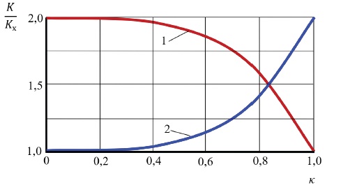 Fig. 5. Level of growth the throughput of the hose K / Kх during the flow of the preservative in a two-layer,