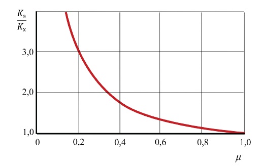 Установим, как меняется ПС шланга Kэ / Kх при прокачке консерванта двухслойным потоком в зависимости от коэффициента понижения вязкости μ. Граничные условия следующие: величина эквивалентного радиуса разделения потока rэ = 0,84R, коэффициент понижения вязкости в диапазоне 1,0 ≥ μ > 0,1. Подставив эквивалентный коэффициент разделения потока (κэ = 0,84) в формулу (8) или (10), определим уровень роста эквивалентной ПС шланга при нагреве консерванта в двухслойном потоке: